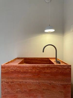 Social Highlight: In bathroom settings, its distinctive Iranian red travertine texture and quality naturally draw attention, serving as both a conversation starter and visual anchor during visits from friends and family.