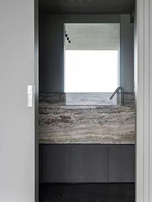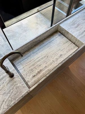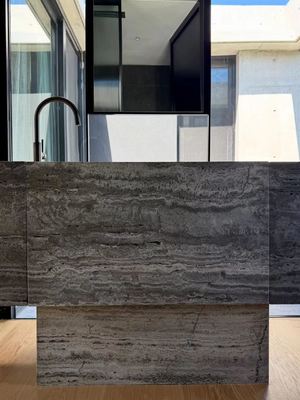 Practicality Meets Beauty: In daily use, its unique dark gray travertine material not only enhances the space’s appeal but also exudes a primitive natural charm through its porous structure, serving as both a conversation starter and visual anchor for visitors.