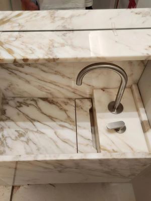 Made exclusively from Calacatta Crestola Marble, the vanity top features a pure, variable warm jade luster, adorned with dynamic golden and warm brown veining that conveys the dazzling texture of mineral veins and the refined ambiance of luxurious living. The natural patterns blend seamlessly with the vanity top’s form, eternally capturing nature’s brilliance and elegance. Transcending ordinary functionality, it becomes a collectible art piece and a captivating visual focal point in any space.