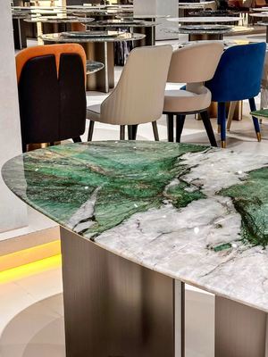 This art dining table merges the natural poetry of emerald with the luxurious essence of marble, turning everyday meals into a delightful dialogue with art and nature. It is both a tribute to the wonders of emerald landscapes and an ultimate expression of high-quality living. Choose it to let the unique rhythm of emerald flow through your space, redefining life amidst the fusion of nature and art—and transforming your home into an eternal sanctuary of artistry.