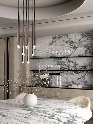 Spatial Centerpiece: Paired with artistic décor and soft furnishings, the veins interplay with light to create a premium "Italian Mineral Luxury" atmosphere, elevating the space with timeless sophistication.